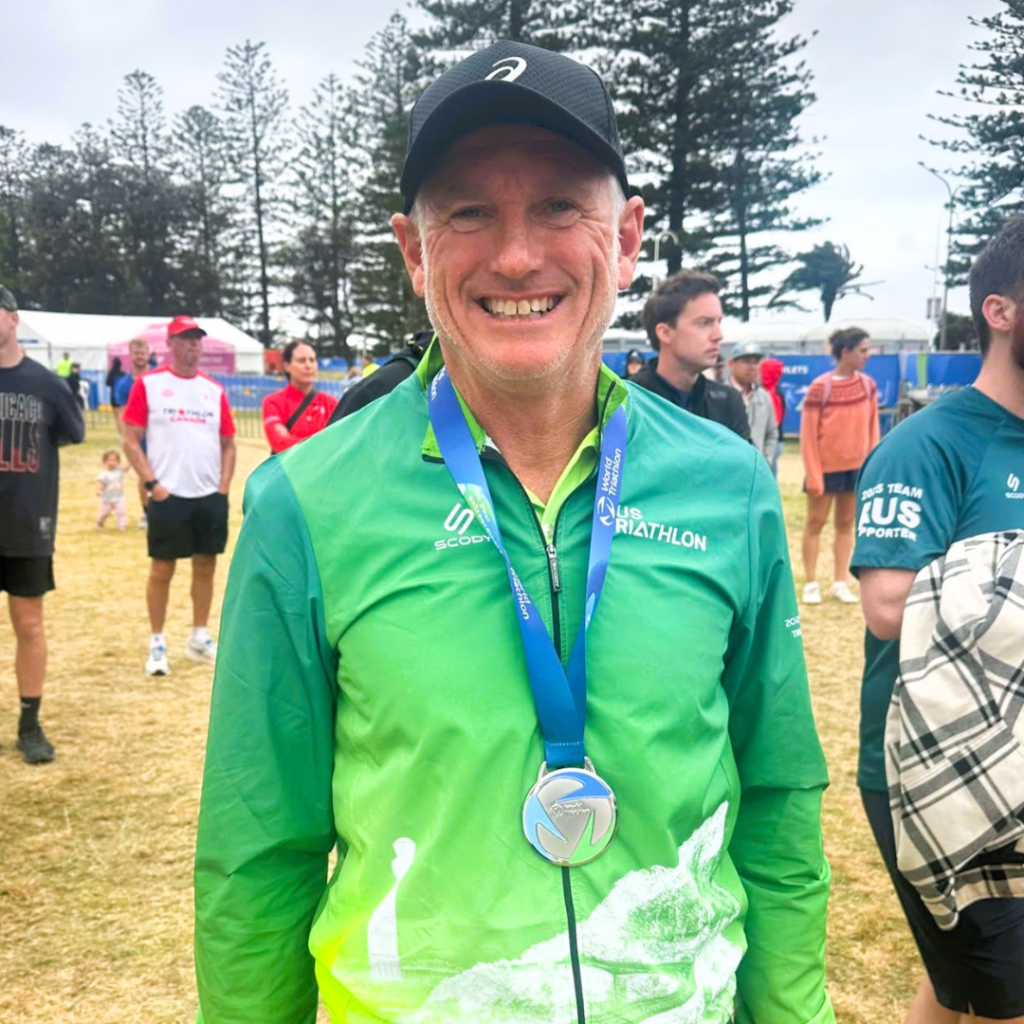 At the 2025 Wollongong World Championships in October, Matt captured the Standard distance World Champion title in the 55–59 Age Category. Remarkably, he backed it up the very next day with a silver medal in the Sprint event.