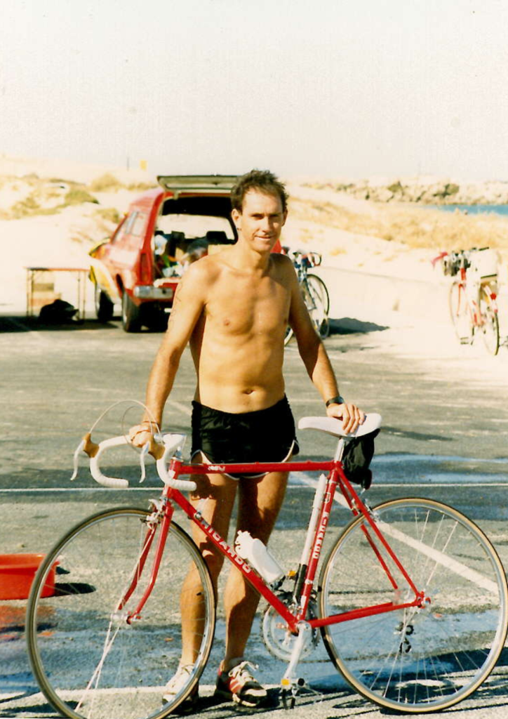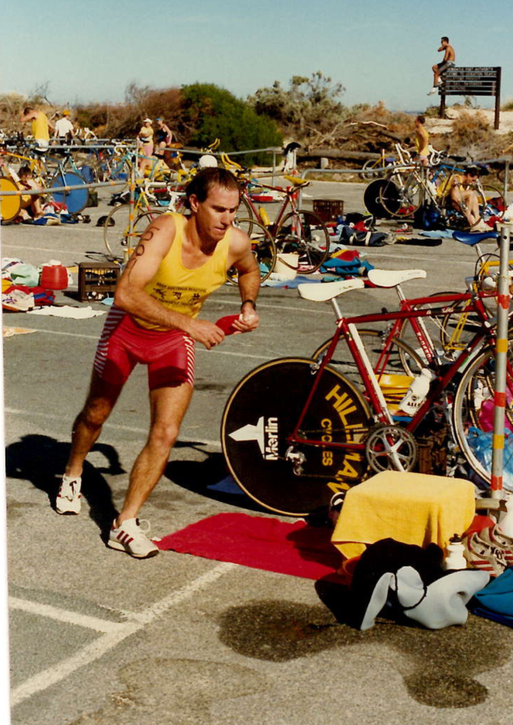 Dave’s triathlon journey began in 1983/84, with his first race held at the North Fremantle Surf Life Saving Club. At the time, triathlon distances looked a little different: a 1 km swim, a 30 km ride, and an 8 km run, with athletes rinsing sand off their feet in buckets beside milk crates before heading out on the bike.